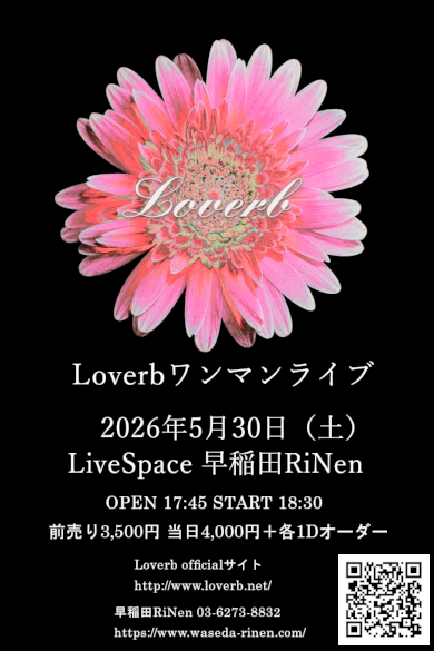 ![]() 2026年5月30日(土) Live Space 早稲田RINen Loverbワンマンライブ OPEN17:45 START18:30 前売り3,500円 当日4,000円 +各1ドリンクオーダー 会場へのお問い合わせ LiveSpace 早稲田RiNen TEL:03-6273-8832 https://www.waseda-rinen.com/ E-mailで前売り予約を受け付けます。 1. メールの件名(subject)に 「予約希望日、会場名、チケット予約」 とご記入ください。 (例:●月●日 渋谷●●● チケット予約) 2. メールの本文に「お名前(ふりがな)、 メールアドレス、予約希望枚数」を ご記入ください。 3.loverb007@nifty.com 宛に送信ください。 4. 受付後、予約完了メールを返信 いたしますので、内容をご確認ください。 (予約メール送信後、2日以上経過しても 返信メールが届かない場合は、受付が できていない可能性があるため、お手数ですが loverbstore@yahoo.co.jpまでご連絡ください。) ※E-mailでの前売り予約受付は、ライブ開催日 2日前までとさせていただきます。 ※前売りでSold outした場合、当日券の発売は ございません。 |
